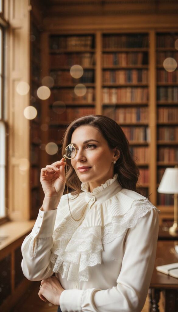 The neck area is a focal point in Victorian fashion. A blouse with a jabot (that ruffled lace detail at the chest) or a high-neck collar exudes strict elegance. This is the perfect layering piece to go under a vest or corset because the ruffles spill out, adding texture and complexity to the chest area. It softens the look of leather and hardware, providing a necessary balance.