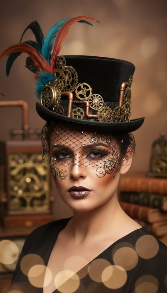 The silhouette of a top hat is instantly recognizable. For ladies, a mini top hat pinned at a jaunty angle often works better than a full-sized one, as it doesn’t overwhelm the face. Customization is the name of the game here: wrap it in a leather band, stick some pheasant feathers in it, and glue on some brass gears. It adds height and a touch of formal whimsy to the ensemble.