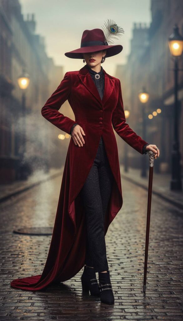 Borrowing from the boys is a staple of this fashion genre. A fitted velvet tailcoat adds a layer of aristocratic sophistication. Look for deep jewel tones like emerald green, royal blue, or burgundy. The structure of the shoulders and the sweep of the tails create a powerful, commanding silhouette. Pair this with fitted trousers or a pencil skirt for a ‘mad scientist’ or ‘airship captain’ aesthetic.