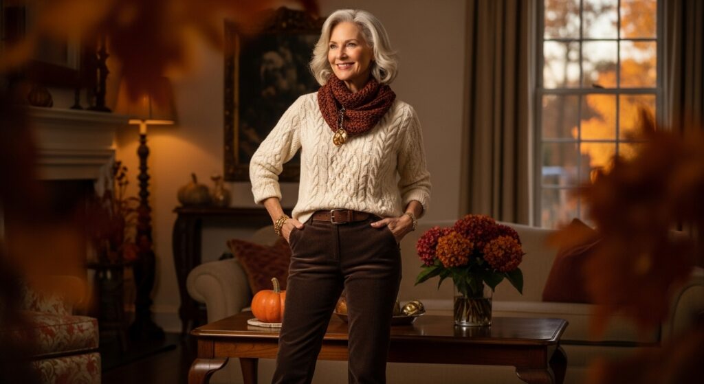 Nothing says “autumn” quite like the combination of corduroy and cable-knit. Modern corduroy pants come in flattering cuts like straight-leg, offering a soft alternative to denim. Paired with a classic cream or camel-colored cable-knit sweater, this outfit is the definition of cozy, preppy chic for a family gathering. A great sweater to consider is the Amazon Essentials Women’s Fisherman Cable Crewneck Sweater.