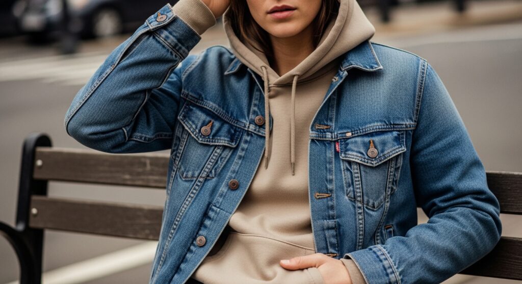 For the ultimate in casual comfort and street style, layer your favorite denim jacket over a soft hoodie. This is the perfect ensemble for a relaxed weekend, running errands, or a long-haul flight. It’s practical, warm, and effortlessly on-trend, giving you a laid-back vibe that’s always in style. To nail this look, you could start with the Hanes Women’s EcoSmart Full-Zip Hoodie.