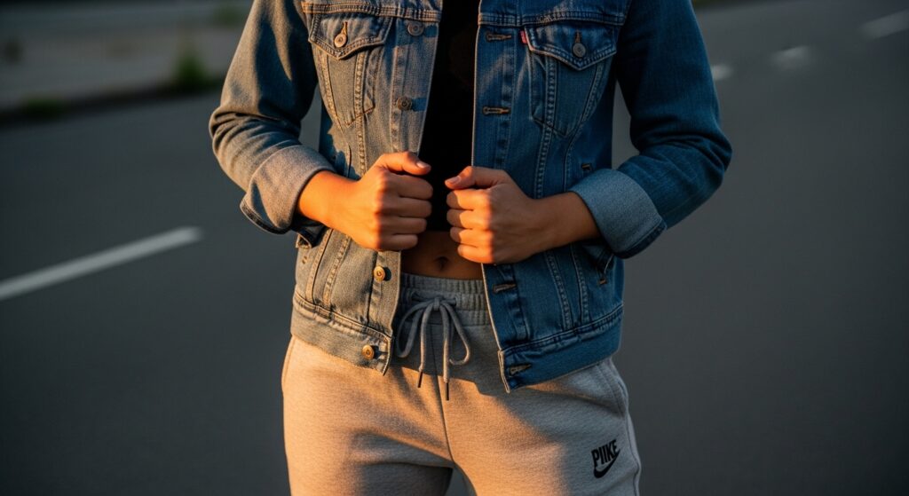 Effortlessly elevate your favorite comfy joggers by throwing a denim jacket on top. This simple addition instantly transforms an athleisure outfit from gym-ready to street-style chic. Paired with a fitted tank and fresh sneakers, it’s the ultimate cool and comfortable look for your day off. A wonderful companion for your jacket would be the CRZ YOGA Women’s Stretch Lounge Sweatpants.