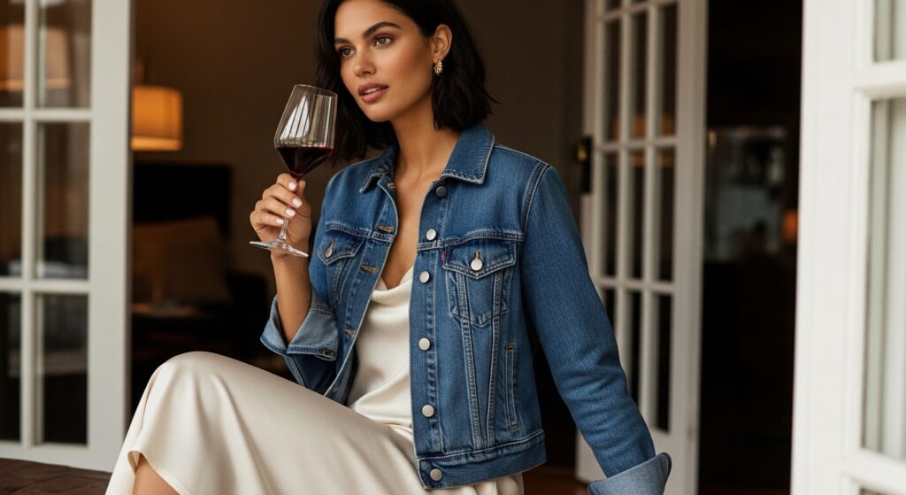 Create a stunning juxtaposition by layering a casual denim jacket over a luxurious silk or satin slip dress. This unexpected pairing is the epitome of high-low dressing, blending casual with elegant for a look that’s perfect for a date night or evening out. It adds a touch of effortless cool to an otherwise formal piece. The The Drop Women’s Ana Silky V-Neck Midi Slip Dress is an excellent option.