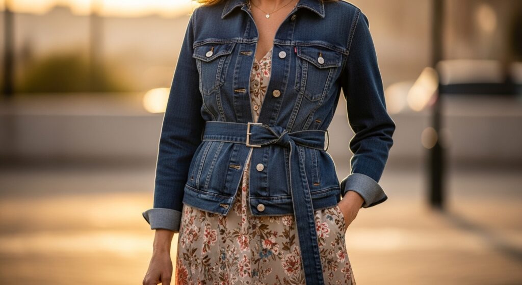 Here’s a simple styling trick to completely change your look: add a belt over your jean jacket when layering it on top of a dress. This instantly cinches your waist, creating a more defined and flattering hourglass silhouette. It adds a touch of polish and intention to your outfit. Try this technique with the SANSTHS Women’s Leather Belt.