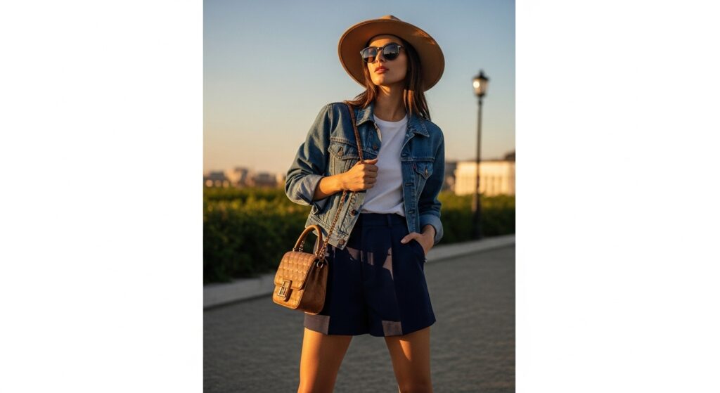 Elevate your summer shorts-and-tee combination by adding a light-wash denim jacket. Pairing it with more structured, tailored shorts instead of denim cut-offs creates a more polished and put-together look. It’s the perfect outfit for a breezy summer evening, a casual dinner, or exploring a new city. For the shorts, we suggest the GRACE KARIN Women’s Casual Paper Bag Shorts.
