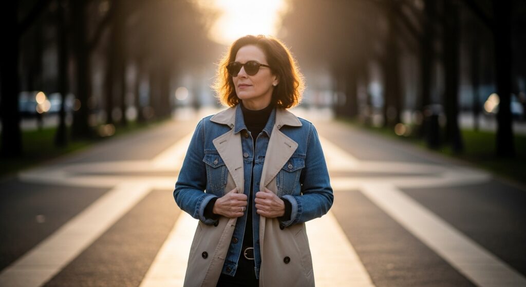 Master the art of layering for transitional weather by wearing your jean jacket as a mid-layer under a classic trench coat. This adds an unexpected element of texture and provides extra warmth on chilly days without adding too much bulk. It’s a fashion-forward move that is both stylish and practical. The Orolay Women’s Double Breasted Trench Coat makes a great outer layer.