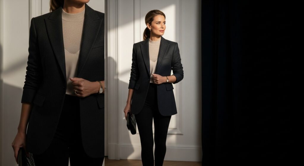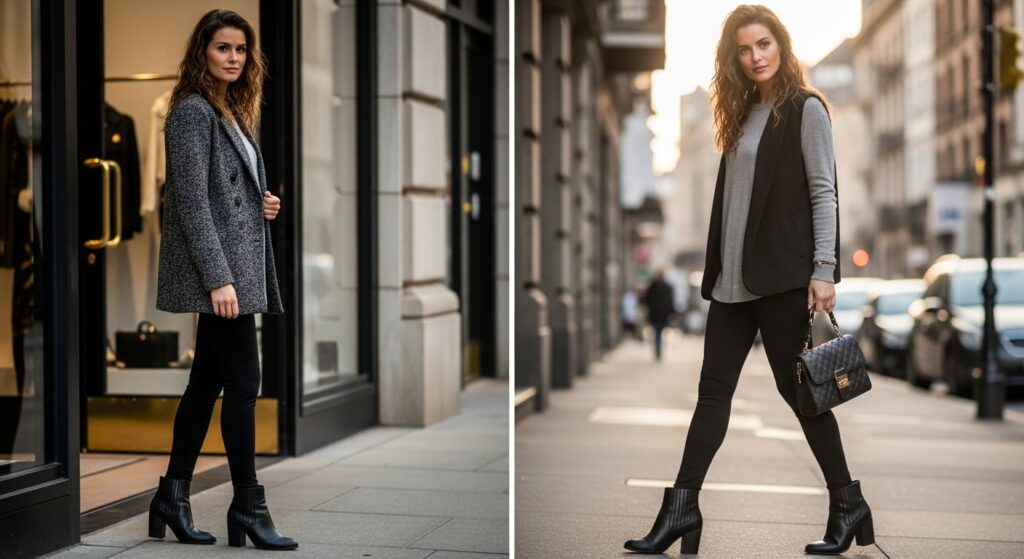 Who says leggings can’t be dressed up? Throwing a structured blazer over a simple top and leggings instantly elevates the entire outfit. This smart-casual look is perfect for a creative workplace, a stylish brunch, or a dinner out. It masterfully blends comfort with sophistication, proving that leggings can be part of a polished ensemble. The Cicy Bell Women’s Casual Blazer is a popular choice for achieving this look.