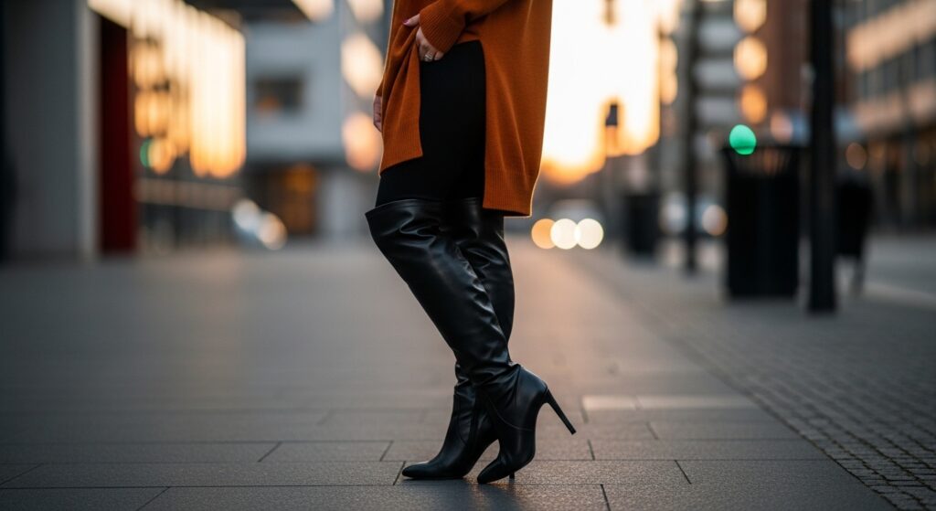 For a sleek and polished look, especially in colder months, pair your leggings with knee-high boots. This combination creates a long, lean line that is incredibly flattering. It’s perfect for wearing with a long sweater, a tunic, or even a sweater dress for a sophisticated outfit that keeps you warm. Flat riding boots offer a classic feel, while heeled versions add glamour. A fantastic pair to try is the DREAM PAIRS Women’s Knee High Riding Boots.