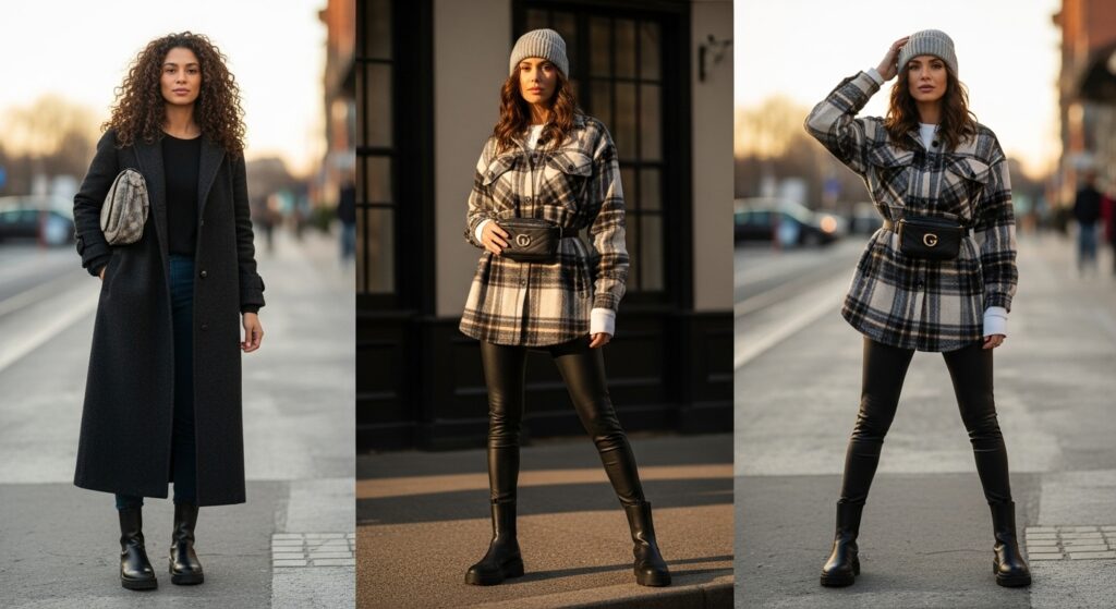 The shacket, a hybrid of a shirt and a jacket, is a modern essential that looks amazing with leggings. It offers more warmth than a regular shirt but is less bulky than a full-on jacket, making it perfect for layering. Typically made of flannel or corduroy, it adds texture and a trendy, slightly oversized silhouette to your outfit. The AUTOMET Women’s Plaid Shacket is a very popular and stylish choice.