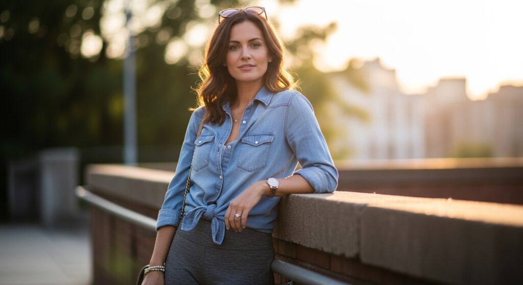 Similar to a denim jacket but lighter, a chambray shirt is a fantastic layering piece. Wear it open over a t-shirt or tank top, or tie it around your waist for a classic ’90s-inspired, casual vibe. The soft, lightweight fabric makes it comfortable for year-round wear, and its relaxed aesthetic pairs perfectly with the casual nature of leggings. A great addition to any wardrobe is the Amazon Brand – Goodthreads Women’s Washed Cotton Boyfriend Tunic.