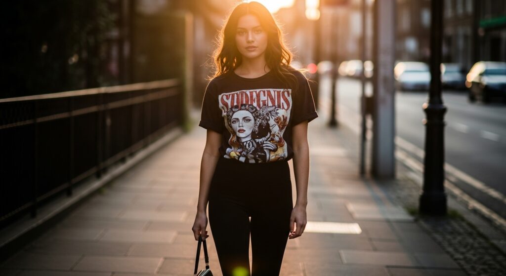 Let your personality shine by pairing your leggings with a cool graphic t-shirt. This is the go-to combination for a casual, edgy, and expressive look. Whether it’s a vintage band tee or a shirt with a witty slogan, it adds a fun element to your outfit. Layer with a denim or leather jacket to complete the look for a concert or a weekend hangout. A great base for this style is the Feelin Good Tees Graphic Novelty T-Shirt.