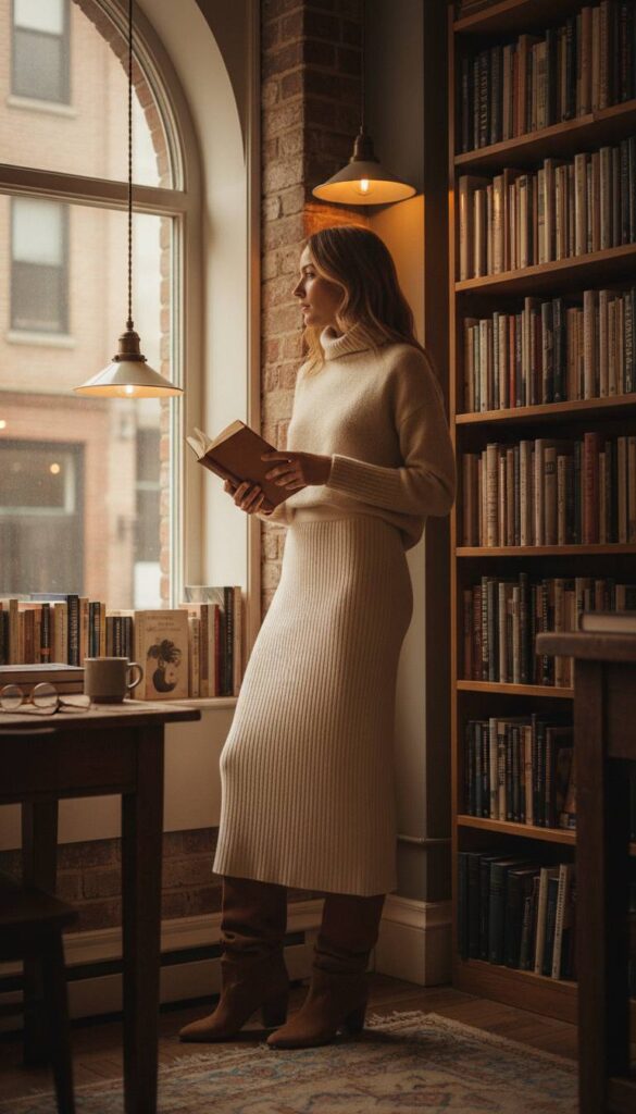 Imagine the comforting weight of a ribbed, cream-colored knit maxi skirt falling to the ankles, its texture a soft counterpoint to the city’s hard edges. Paired with slouchy, cognac suede boots that gather just so, the silhouette is one of relaxed elegance. This look thrives in the warm, amber light of a quiet bookstore or a corner café. The visual is all about tactile comfort: the chunky weave of the skirt, the supple nap of the suede, and perhaps a cashmere turtleneck in a complimentary oatmeal hue, creating a monochromatic study in softness.
