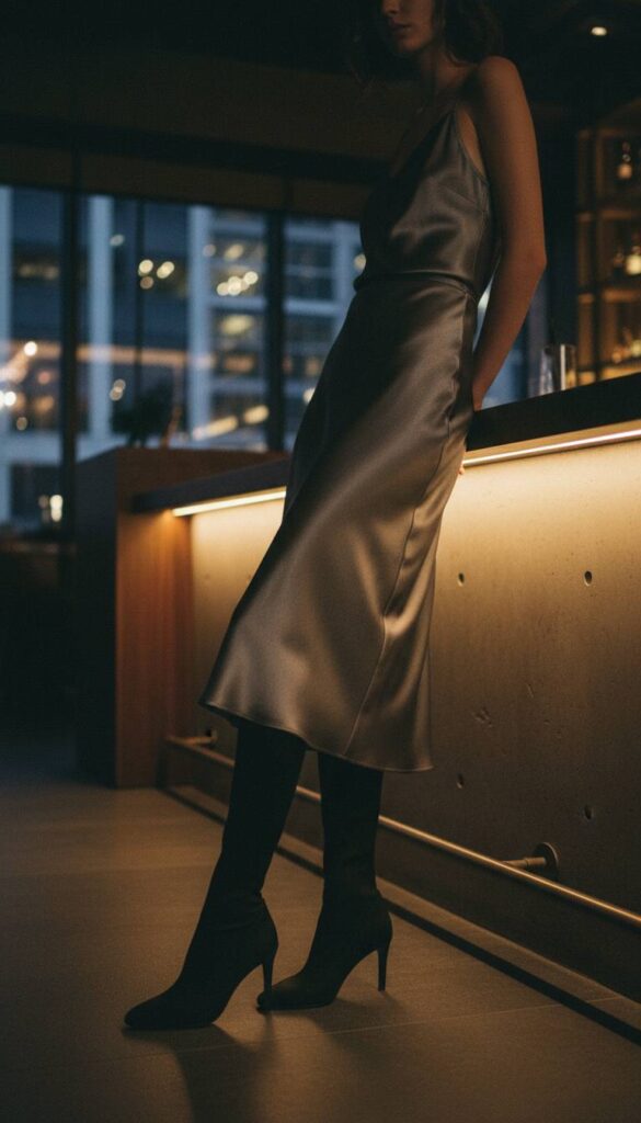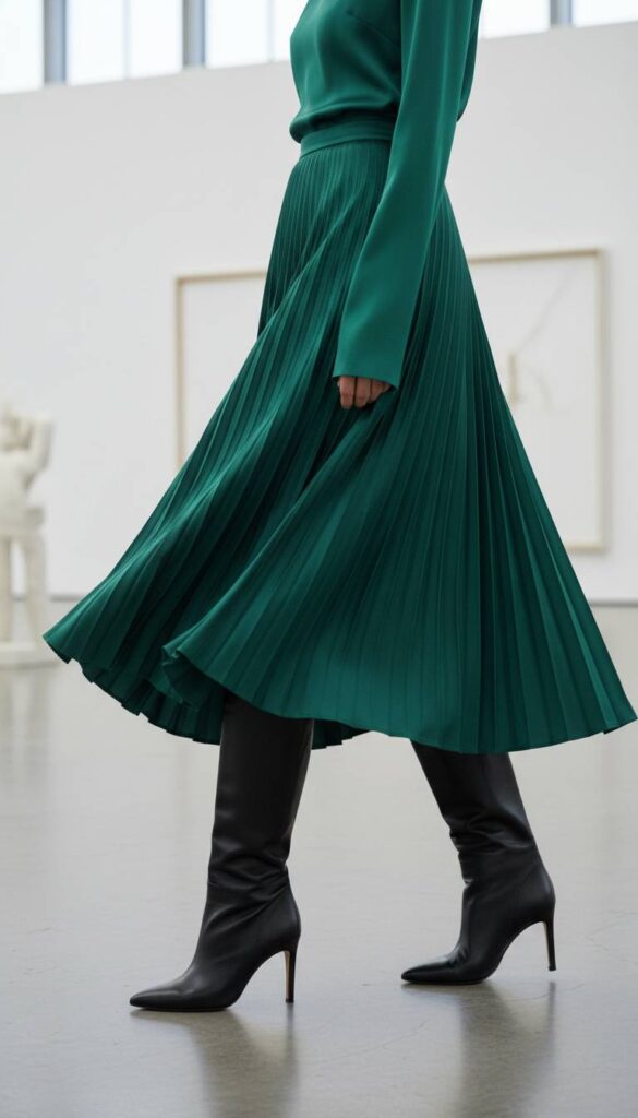 Fluidity meets structure in this eternally sophisticated combination. A finely pleated midi skirt in a deep emerald or sapphire satin creates a mesmerizing sense of movement with every step. Tucked neatly inside are sleek, black leather knee-high boots with a sharp stiletto heel, creating a seamless, elongated line. The setting is a minimalist art gallery with white walls and polished concrete floors, where the skirt’s jewel tone can truly pop. The interplay of the fabric’s liquid drape against the rigid, sculptural form of the boot is a masterclass in modern grace.