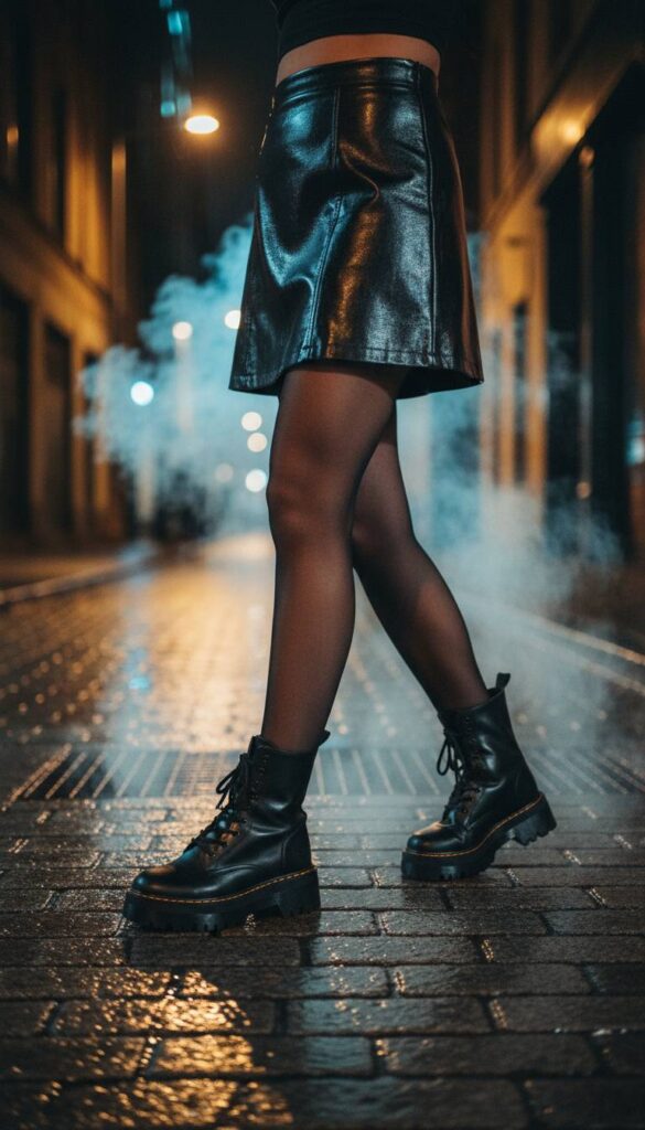 This pairing is pure, unapologetic urban poetry. Picture the high-gloss sheen of a black leather miniskirt catching the fragmented city lights, its sharp A-line cut a stark contrast to the rugged utility of platform combat boots. The scene is a rain-slicked cobblestone alleyway, steam rising from a subway grate. The key is in the details: sheer black tights offering a hint of vulnerability, and the satisfying heft of the boots’ lug soles against the pavement. It’s a look that’s both protective and provocative, built for navigating the concrete jungle with attitude.