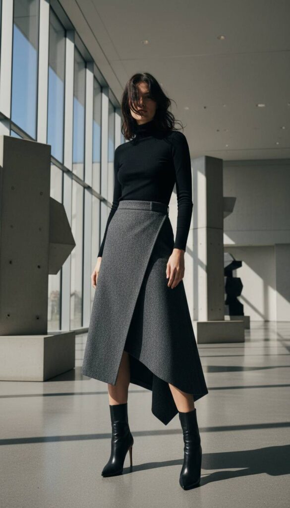 This is a statement in architectural dressing. A wrap skirt in a heavy, structured charcoal wool features a dramatic, asymmetrical hemline that cuts across the leg at an unexpected angle. The footwear must be equally deliberate: a pair of stiletto-heeled booties in a smooth, unforgiving black leather that hugs the ankle. The ideal backdrop is a museum of modern art, where the skirt’s bold lines can echo the surrounding architecture. It is a powerful, directional look that plays with geometry and highlights the sharp precision of a killer heel.