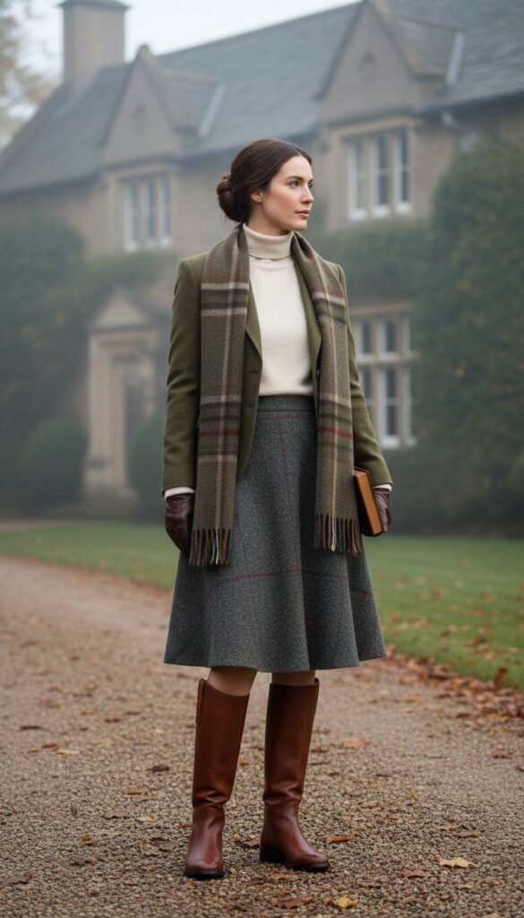 Evoking windswept moors and academic heritage, this pairing is timeless. A high-waisted, A-line tweed skirt, woven with threads of heather grey, forest green, and burgundy, sits just above the knee. It’s met by impeccably crafted brown leather riding boots, their form unadorned and functional. This outfit belongs to a crisp autumn morning on a country estate, the air smelling of woodsmoke and damp earth. The texture of the wool tweed against the smooth, burnished leather of the boots offers a rich, sensory experience rooted in classic, enduring style.