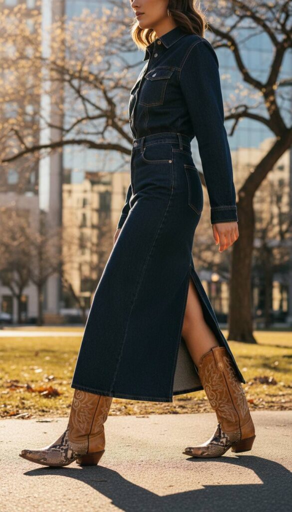 The current renaissance of the denim maxi finds its perfect partner in the Western boot. A column-like skirt in a dark indigo wash, perhaps with a subtle front slit for movement, provides a utilitarian canvas. Peeking from beneath are intricately stitched cowboy boots in a distressed tan or daring snakeskin print. Photographed against the backdrop of a sun-drenched urban park in late winter, the look feels both grounded and fashion-forward. The rugged texture of the denim plays off the decorative flair of the boots, striking a perfect balance of Americana cool.