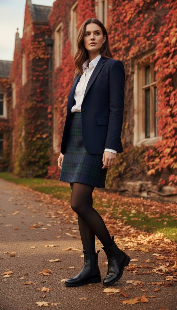 Channeling a smart, academic vibe, this combination is sharp and eternally stylish. A tailored wool miniskirt in a classic Black Watch or Prince of Wales check offers a touch of heritage. The perfect anchor is a pair of polished, black leather Chelsea boots with their signature elasticated sides. The setting is an ivy-covered university campus, leaves crunching underfoot. Paired with opaque black tights and a tailored navy blazer, the ensemble is a lesson in smart layering, where the crisp lines of the skirt are echoed by the clean silhouette of the boots.