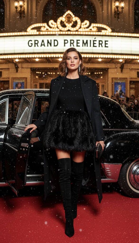 Maximum impact is the goal with this opulent pairing. Envision a mini or midi skirt crafted from plush, deep black or snow white faux fur, a statement piece that is both decadent and impossibly cozy. The only boot that can stand up to such drama is a thigh-high, over-the-knee style in black suede, creating a long, uninterrupted leg line. This ensemble is for a grand night out, emerging from a classic car onto the red carpet of a theater premiere. The contrasting textures of the lush fur and the sleek suede are pure cinematic glamour.