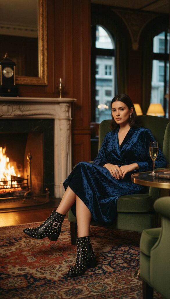 Perfect for holiday festivities, this combination is rich in both color and texture. A midi skirt in sumptuous crushed velvet, perhaps in a deep burgundy or midnight blue, catches the light with a subtle, painterly sheen. The boots are the centerpiece: black ankle boots adorned with delicate pearl studs or crystal-encrusted buckles. The setting is a historic hotel lounge, seated by a roaring fireplace. The soft pile of the velvet and the hard glint of the embellishments create a look that is celebratory, luxurious, and full of intricate detail.
