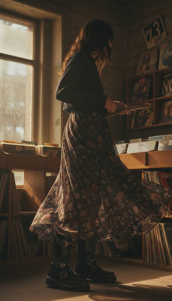 The ‘wrong shoe’ theory at its absolute best. A floor-sweeping maxi skirt in a dark, moody floral print on sheer chiffon seems delicate, almost fragile. Now, anchor it with the unapologetic stomp of heavy, buckled biker boots. The contrast is electrifying. Picture this in a dusty vintage record store, the soft, diaphanous fabric of the skirt swirling around the tough, weathered leather of the boots. This grunge-meets-bohemia aesthetic is all about intentional discord, creating a look that is unexpectedly romantic, deeply cool, and utterly compelling.